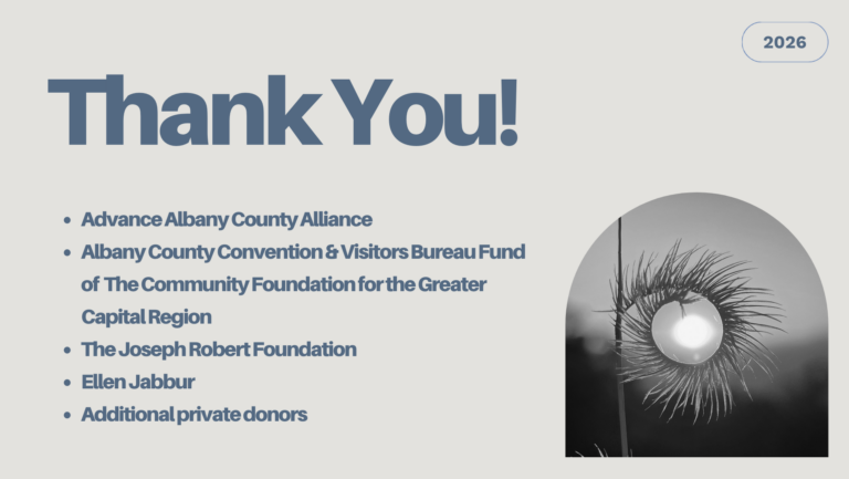 The project is supported in part by the Advance Albany County Alliance Arts and Culture Grant program, the Albany County Convention and Visitors Bureau Fund of The Community Foundation for the Greater Capital Region, the Joseph Robert Foundation, Ellen Jabbur, and additional private donors.